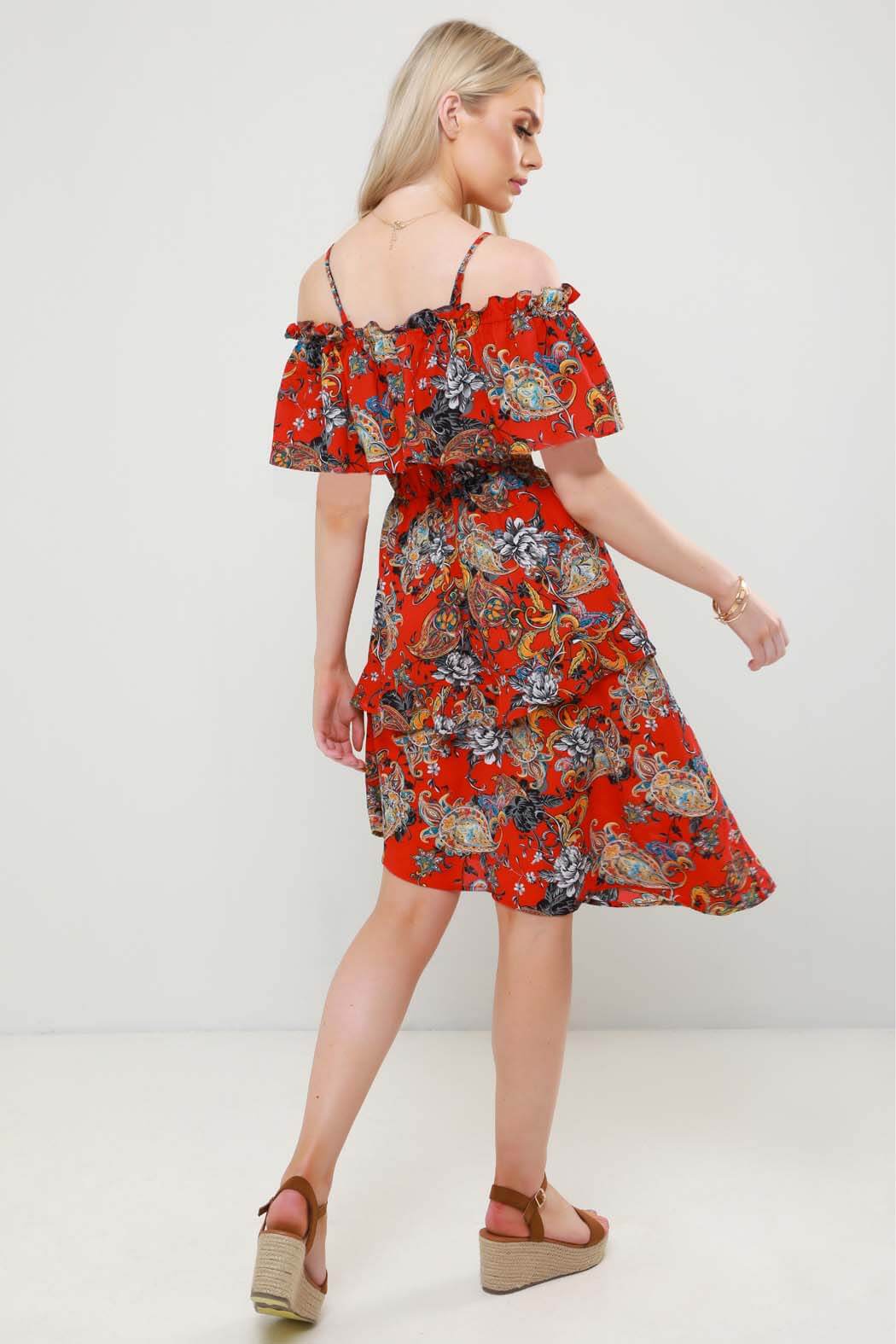 Anita Red Paisley Asymmetric Ruffle Midi Dress