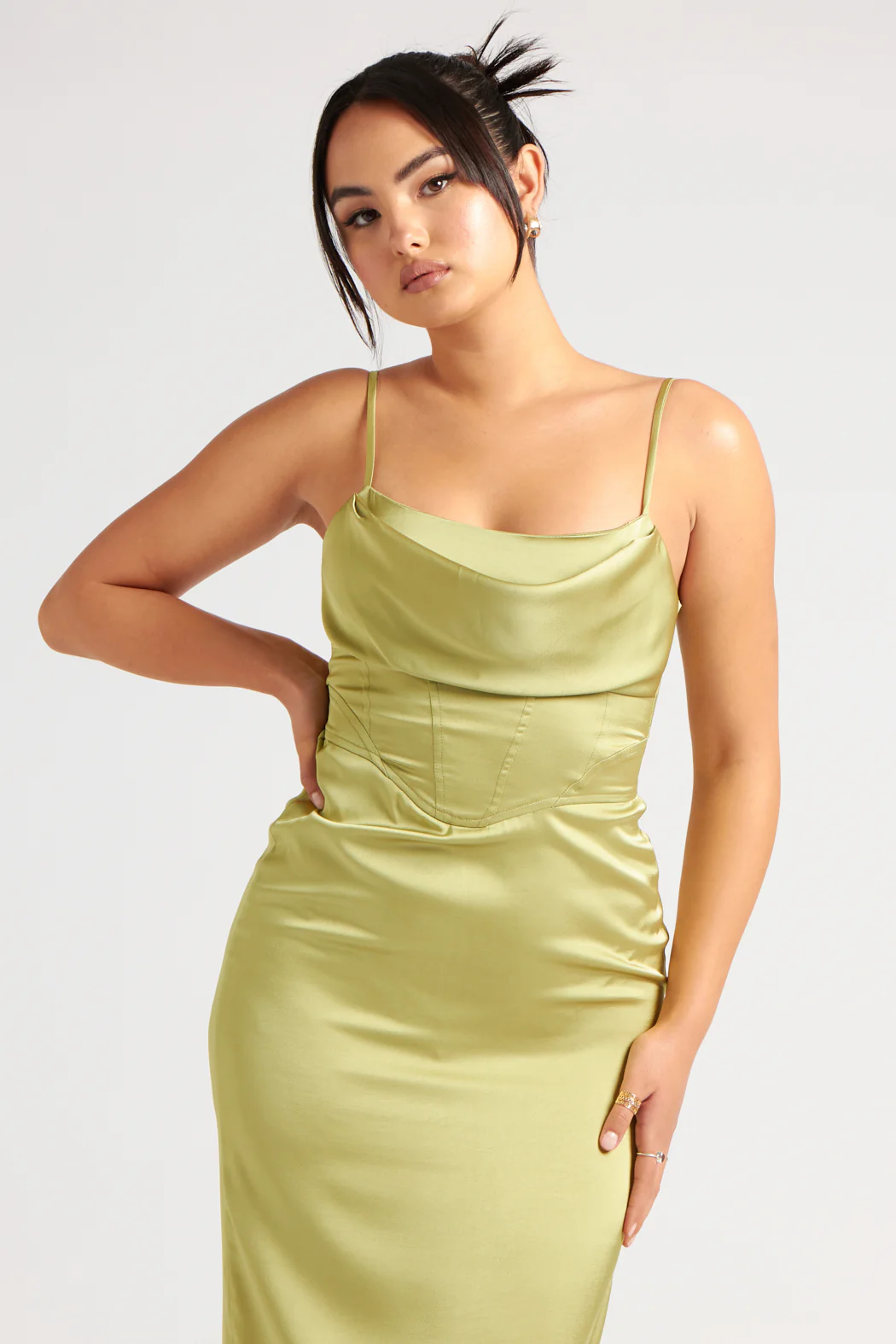 The perfect night out midi dress featuring a flawless fitted silhouette with a belle corset pattern and delicate spaghetti straps.